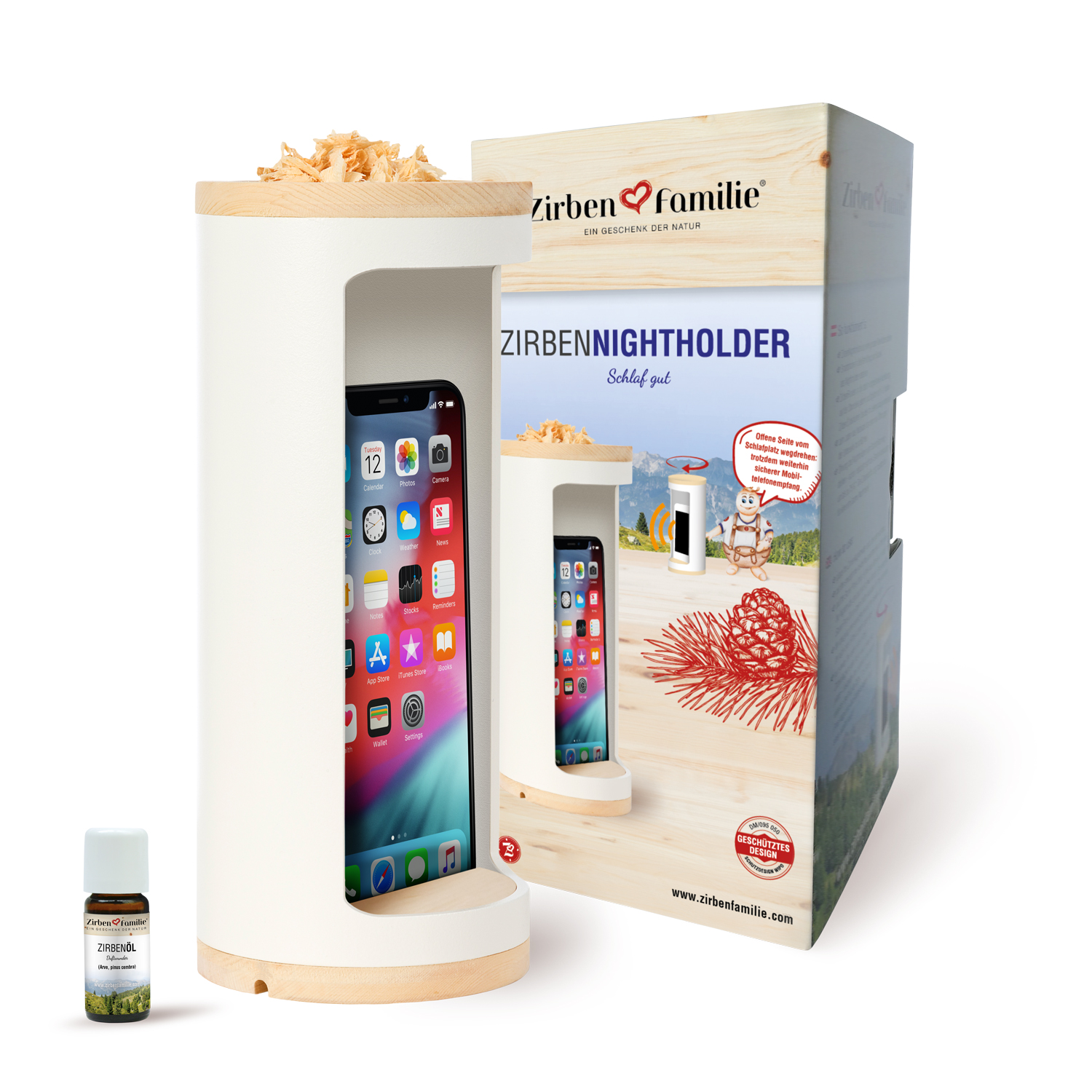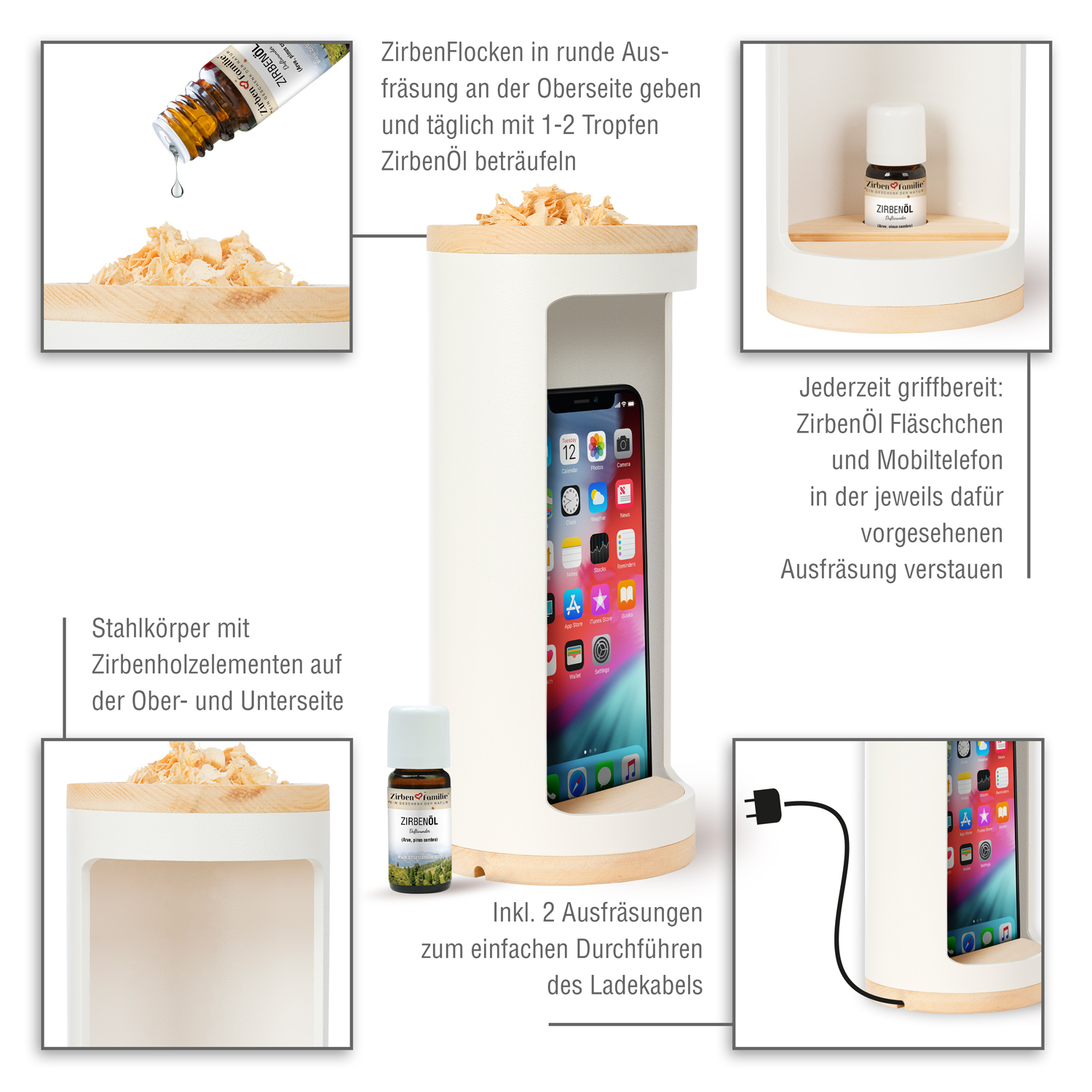 Das Geniale dabei - durch die Konstruktion mit dem schalenartigen Zirbenholzdeckel und dem, für ein einfaches Durchführen der Kabel zum Laden ausgefrästen, Sockel, hat der Holder einen stabilen Stand und kann für einen wohligen und erholsameren Schlaf, oben mit Zirbenflocken befüllt werden, welche mit dem inbegriffenen ätherischen Zirbenöl (10ml inklusive) beträufelt und anschließend zum Raumbedufter werden.