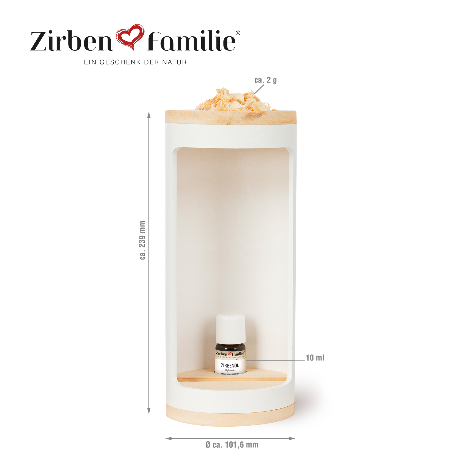- 10ml ebenfalls naturbelassenes, wasserdampfdestilliertes, ätherisches Zirbenöl, sowie ein Säckchen ZirbenFlocken inklusive