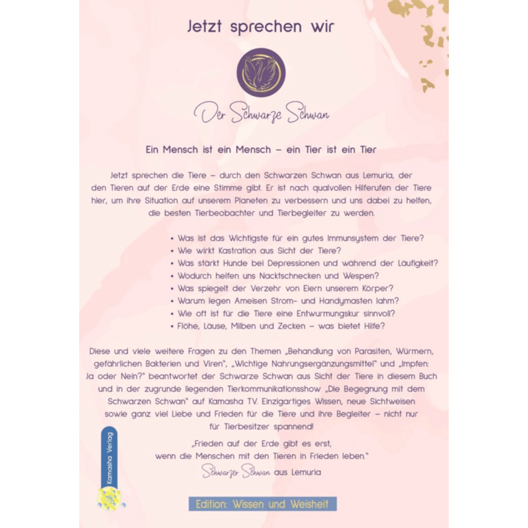 Diese und viele weitere Fragen zu den Themen „Behandlung von Parasiten, Würmern, gefährlichen Bakterien und Viren“, „Wichtige Nahrungsergänzungsmittel“ und „Impfen: Ja oder Nein?“ beantwortet der Schwarze Schwan aus Sicht der Tiere in diesem Buch und in der zugrunde liegenden Tierkommunikationsshow „Die Begegnung mit dem Schwarzen Schwan“ auf Kamasha TV. Einzigartiges Wissen, neue Sichtweisen sowie ganz viel Liebe und Frieden für die Tiere und ihre Begleiter – nicht nur für Tierbesitzer spannend!